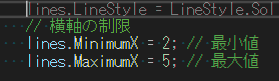 OxyPlotでは線を描画する際に、どこまで表示させるかの制限値を設定することができます。その設定は各軸(X,Y)毎に設定することが可能です。X軸はMinimumXプロパティ(最小値)とMaximumXプロパティ(最大値)があり、Y軸ではMinimumYプロパティ(最小値)とMaximumYプロパティ(最大値)があります。これらのプロパティを使用することで、線の表示を制限し、線の長さを決めることが可能です。
