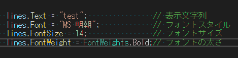また表示するテキストの位置や方向・色も変更できます。TextLinePositionプロパティで表示位置、TextColorプロパティでテキストの色を変更でき、TextOrientationプロパティで横書きか縦書きを設定できます。